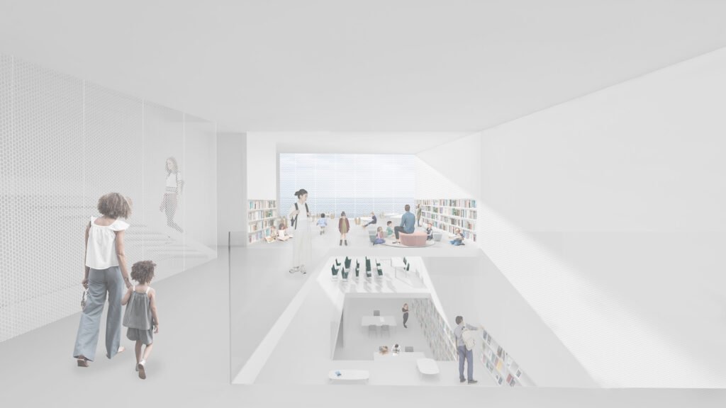 Lo que a priori puede suponer la mayor dificultad de concurso, es la base del planteamiento de proyecto. El objetivo es extender las condiciones de iluminación y ventilación natural de las plantas sobre rasante a los niveles bajo rasante, para ganar más superficie cualificada espacialmente, con la que desarrollar de forma óptima el programa funcional. A la compacidad hay que unirle la transparencia. La propuesta desarrolla todas sus plantas de forma diáfana lo que permite, en primera y segunda planta, incorporar las extraordinarias vistas del mar, y desarrollar una arquitectura interior a la escala de un edificio público. Dada la singularidad del edificio, se plantea para sus fachadas a Calle de la Iglesia y su frente sur, una solución alternativa pero respetuosa con las preferencias de la ordenanza tradicional residencial, manteniendo el color blanco predominante en Nerja. Dicha solución consiste (en calle de la Iglesia) en un zócalo continuo de hormigón blanco donde se integrará la rotulación de la biblioteca de forma rehundida, y se dispondrá un hueco único de entrada. Desde el espacio público exterior, dicha fachada se integra con amabilidad y sintonía en el importante conjunto urbano al que pertenece, permitiendo una relación de vistas veladas desde el interior hacía la Plaza del Balcón de Europa y la Iglesia del Salvador